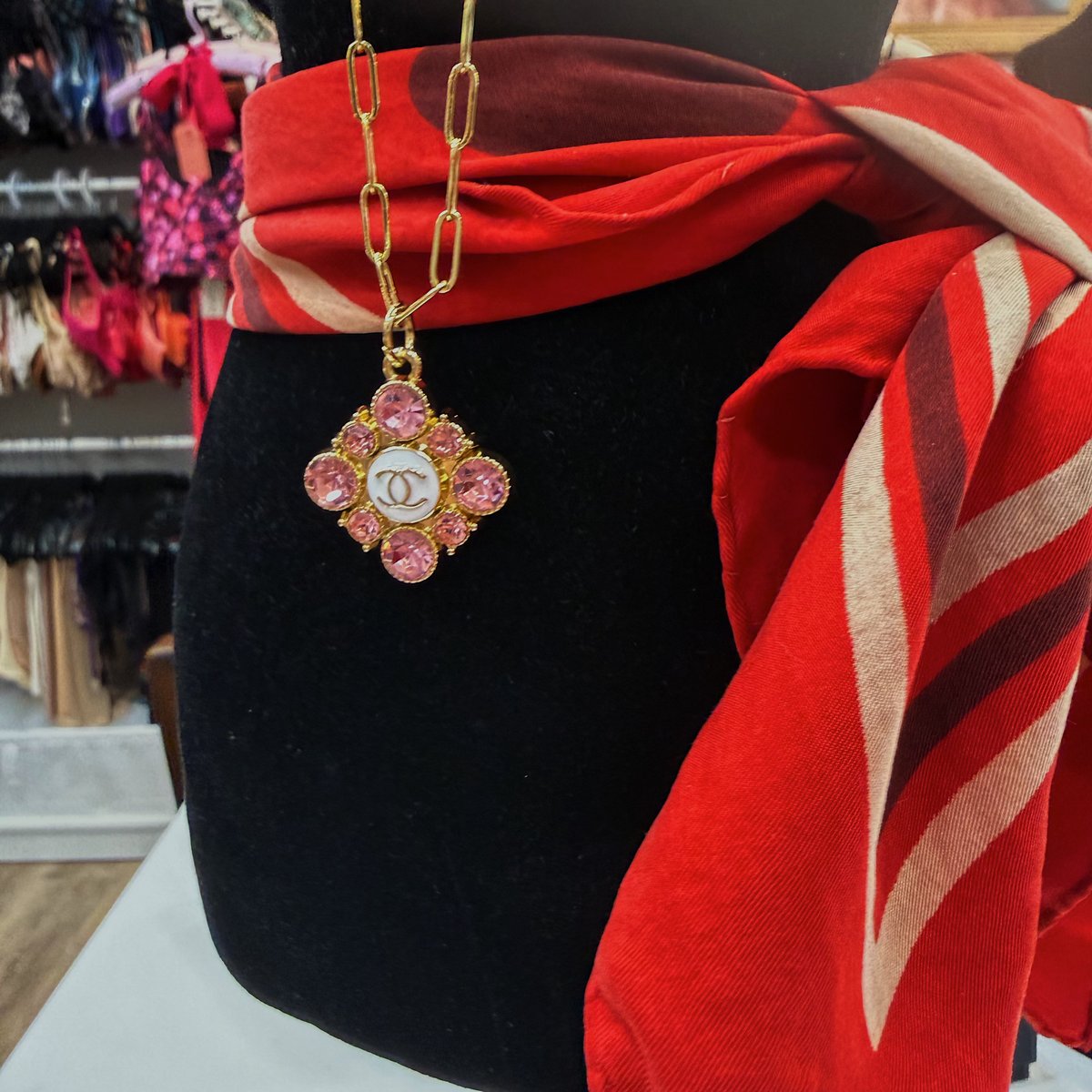 handmade & reworked Chanel pink & gold piece with gold tone chain