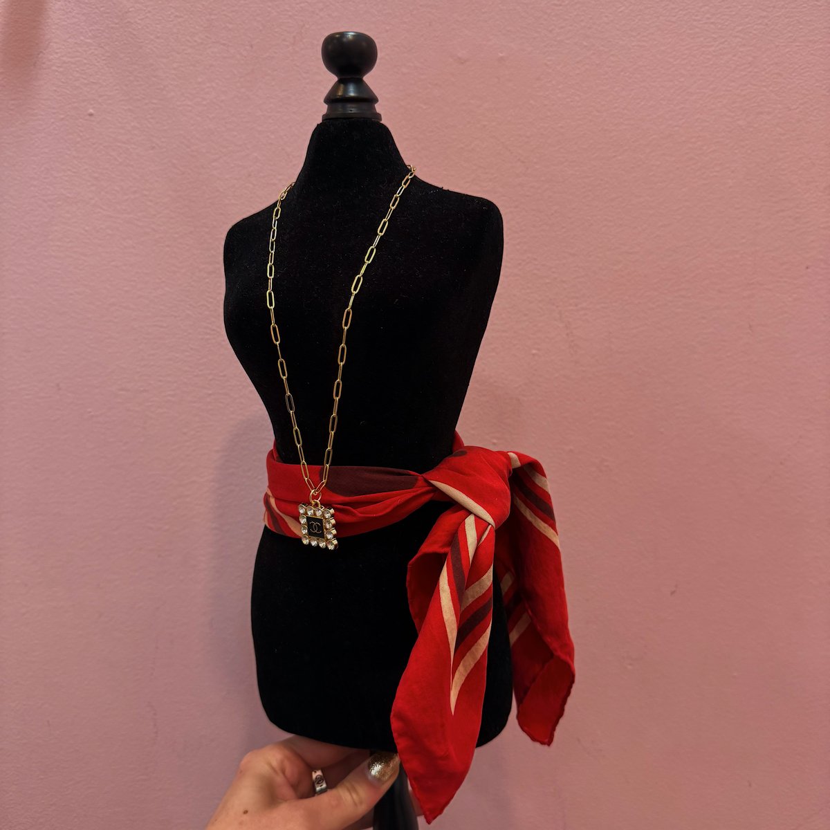 handmade & reworked Chanel black & gold square shaped piece with gold tone chain